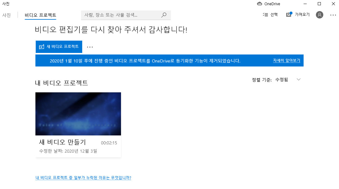 - 우측 상단의 새 비디오 만들기 > 새 비디오 프로젝트를 선택한다.